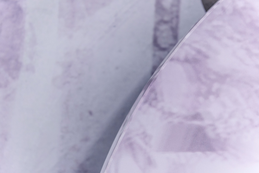 »CMX (Critical Mass X)«, Rauminstallation, 2016, kinetisches Objekt 100 x 5 cm, Motor, Digitaldruck auf Forex und Chiffon, Papierfotodruck 440 cm x 220 cm, Filmloop »CMXre:motion«, Ausstellungsansicht kunst galerie fürth. (Fotografien Ingo Foertsch) 2016
