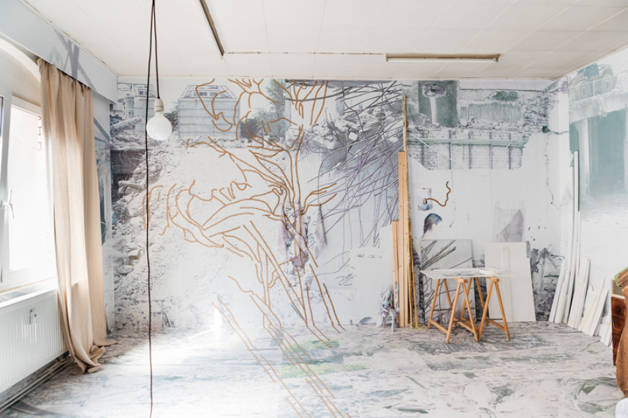 Klebebandzeichnung auf Fototapete und Textil, ca. 40 qm, (Fotografien Ingo Foertsch) 2017