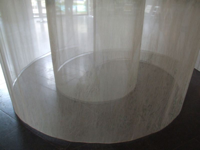 Die autobiografische Arbeit »vaterhaus«, die in der Kapelle ausgestellt war, zeigt in zwei ephemer wirkenden Darstellungen Requisiten aus meiner Kindheit: ein Medaillon mit einem Kreuz und eine Bild mit einem Globus. In der begehbaren Rauminstallation »selbstabwicklung« betritt der Besucher eine Doppelspirale aus einem semi-transparenten Chiffon- Zylinder. Im kreisförmigen Abschreiten der Stoffhülle erscheint audf der Oberfläche meine schreitende Figur die sich mit einem Stock in der Hand durch eine Landschaft bewegt. Die überdimensionale »lilienzeichnung« auf der Wand entpuppt sich bei näherer Betrachtung als eine Collage aus Klebestreifen. Das Reissen und sich schrittweise entwickeln der Linienführung, ermöglicht in der Übergrösse der neuen Zeichentechnik, vor allem ein organisches Abrunden der Linien. Das Selbstportrait im kinetischen Wandobjekt »CMX« steht für »critical mass x«. Damit ist zunächst der physikalische Zustand der »bewegten Masse« angesprochen, mit dem Zusatz »X« erfolgt der Verweis auf das weibliche Chromoson. Die «oktaportaits« sind Portraitstudien von Freunden. Sie wurden von vier Ansichten aus fotografiert, auf Objektuntergrund und das sich darüber spannende transparente Polyestergewebe übertragen. So lässt es die Gesichter räumlich und in achtfacher Version erscheinen. (Text Dr. Stefanie Lieb und Ursula Kreutz, Fotografien Ursula Kreutz) 2016